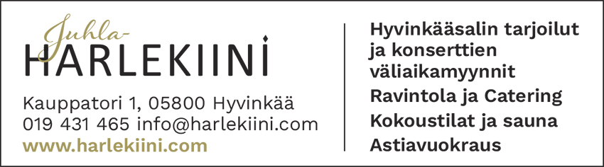 Hyvinkääsalin väliaikatarjoilu hoituu Ravintola Harlekiinin puolesta. Harlekiini on hyvinkääläinen juhla-, kokous- ja ravintolapalveluja tuottava yritys, jolla on jo yli 30 vuoden kokemus ravintola-alalta. Harlekiini loihtii herkulliset menut kaikkiin tilaisuuksiin joko valmiiksi katettuna tai noudettavana. Harlekiinin omissa 200 hengen tiloissa Hyvinkään kauppatorin laidalla on mahdollisuus järjestää perusteellisempi illallinen Hyvinkääsalin tapahtuman jälkeen. Sampotalon saunatiloilla varustetussa Sky-kabinetissa voidaan toteuttaa vaikka tyylikäs fine dining –elämys.