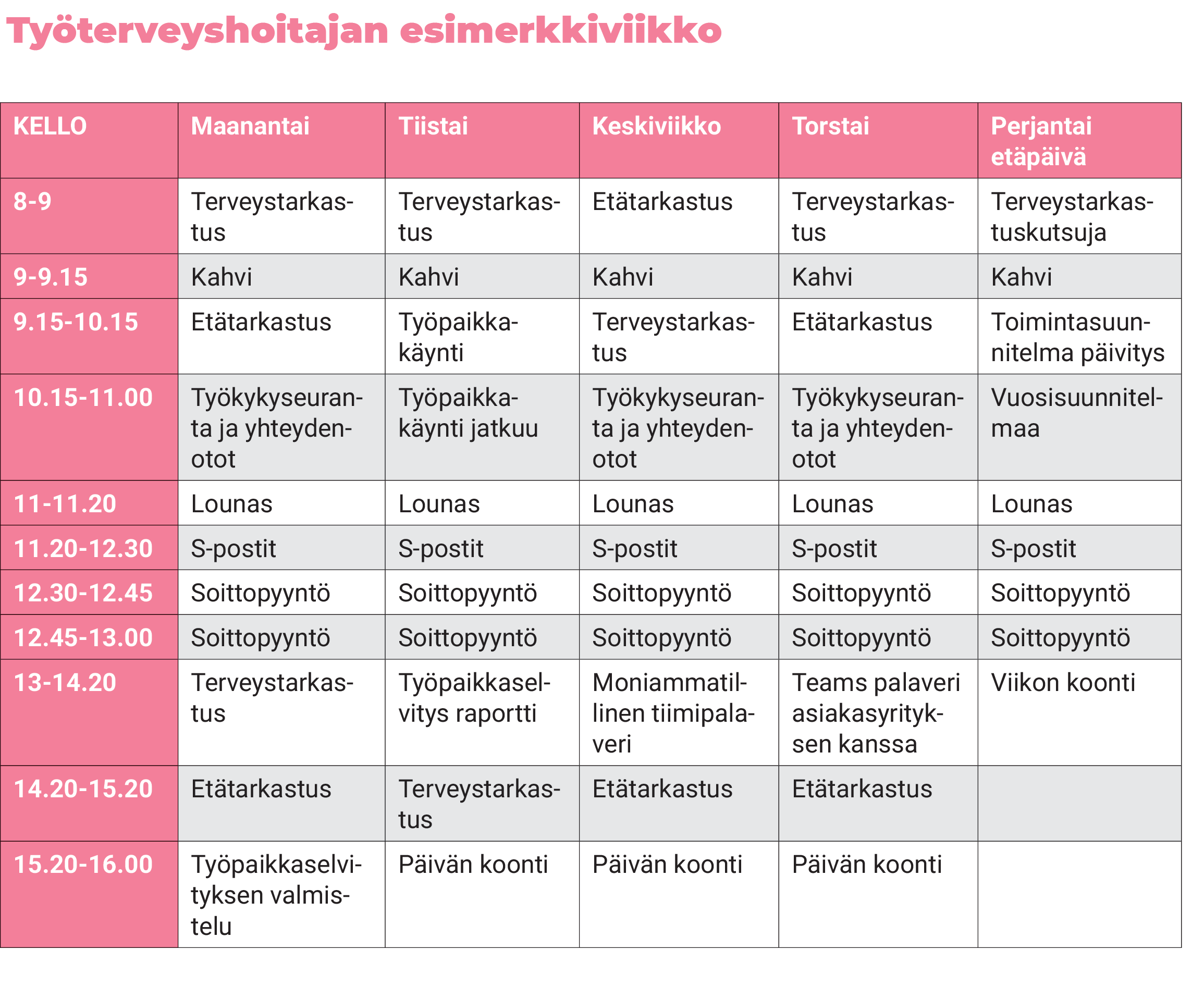 - terveystarkastuskäytännöt sekä työterveyssuunnitelman laatiminen asiakkaalle
